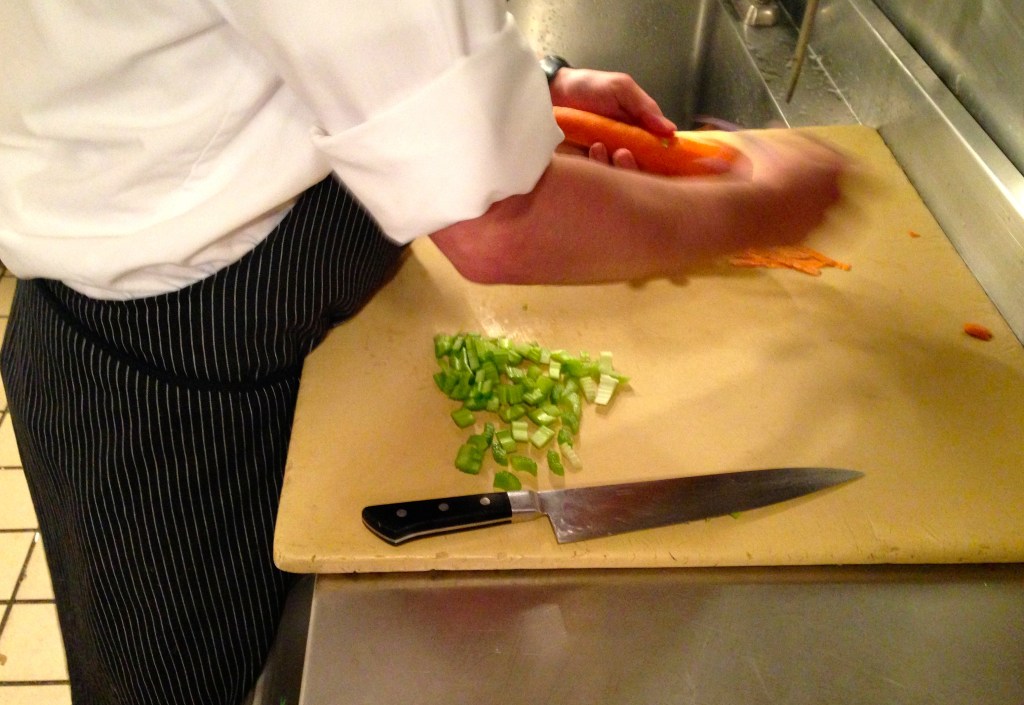 Meanwhile, Oxaal places the shrimp in a large pot of water with spices similar to those used for the potatoes and sets the pot on the stove. To the pot he adds chopped onion, carrot, and celery (see figures 2–3). In another pot Oxaal places the shrimp and enough water to make his shrimp stock. While Oxaal is downstairs doing production, the dining room upstairs is fully immersed in its lunch service. In the midst of preparation, Oxaal is called upstairs to tend to an important issue.