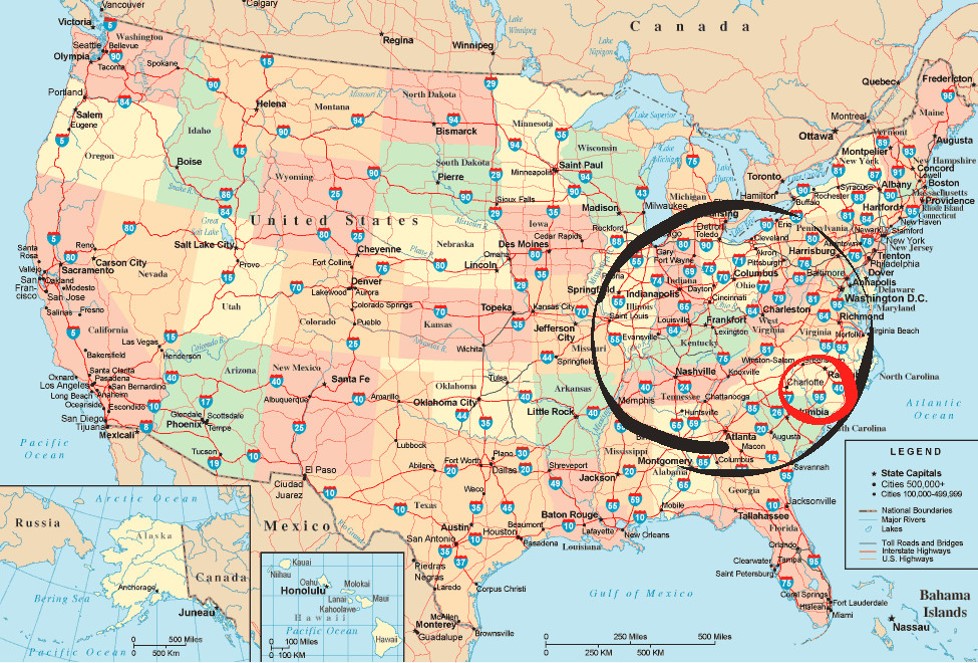 From the above quoted passage, we can extrapolate that a local space has a 120-mile radius. The area of a 120-mile radius measures 45,239 square miles, roughly somewhere between the size of the 31st and 32nd largest states, Mississippi (46,907 square miles) and Pennsylvania (44, 816 square miles).[40] Forty-five thousand square miles is a different sense of “lived space” than Kingsolver initially described as the local place where one works and lives. This further complicates the technical terminology presumed with the ideograph of “local.”